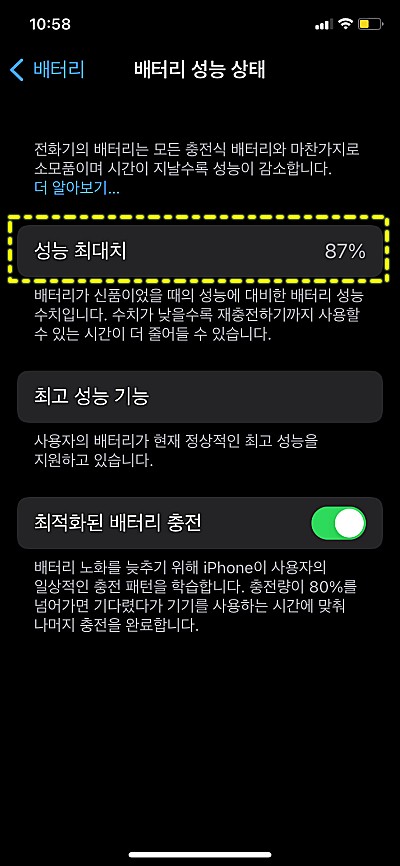 아이폰 [설정]-[배터리]-[배터리 성능상태] 메뉴에 가면, 아래와 같이 배터리 성능을 확인할 수 있다.