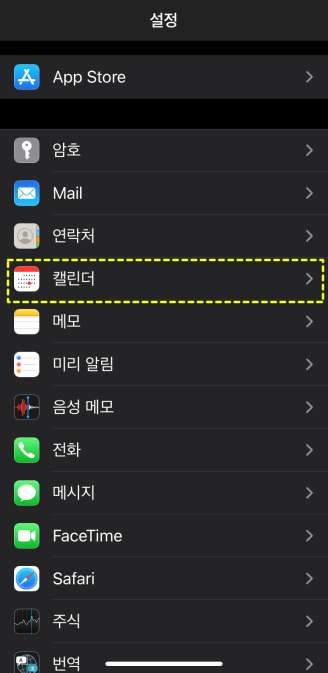 아이폰에서 팀즈 일정을 가져오기 위해서는 아이폰 계정에 팀즈 계정을 등록해야 한다. 팀즈 계정을 등록하기 위해서 아이폰의 [설정] 메뉴로 이동한다. 설정에서 아래로 내려보면 캘린더가 있다. 캘린더를 선택한다.