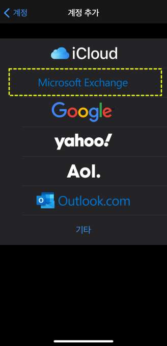 계정 추가를 선택하면 등록할 수 있는 계정이 여러가지 나온다. 이 중에서 Microsoft Exchange를 선택한다.
