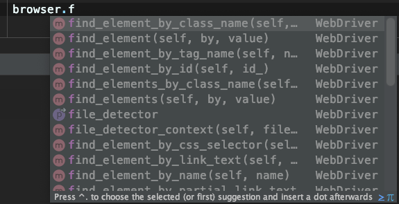 셀레니움(sellenium)에서는 별도로 html파싱을 하지 않아도 된다. 파이참에서 "."을 누르면, 사용할 수 있는 함수 리스트를 볼 수 있다. find로 시작하는 함수명이 보인다. 모두 클래스 이름, id, 태그 등 필요한 정보를 추출할 수 있는 함수들이다.